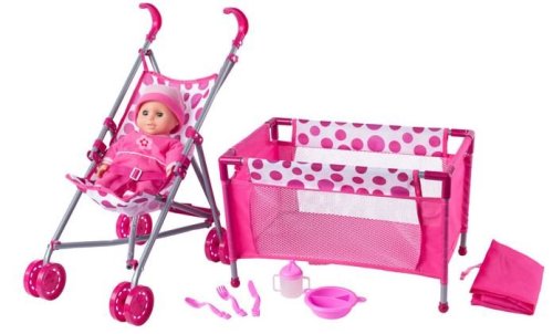 V tomto sete nájdu deti hneď 4 hračky: Žmurkaciu bábiku so zvukmi Riad na kŕmenie bábiky Golfky, ktorých jednoduchý mechanizmus umožňuje rýchle skladanie Postieľku