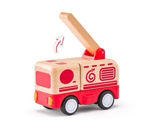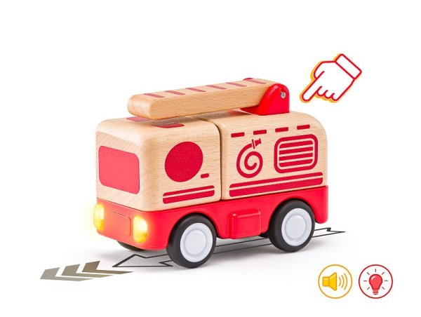 Autíčko so zotrvačníkom Vyrobené z pevného masívneho dreva Určené presne do malej detskej ruky Je vybavené svetlom a zvukom Rebrík na streche autíčka je vyklápací Batérie 3x LR44 1,5V sú súčasťou