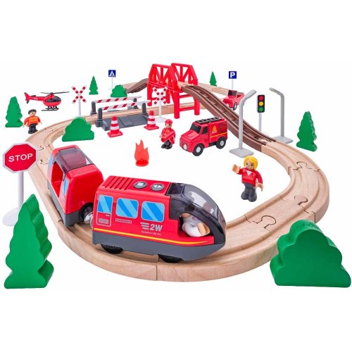 Vláčikodráha so železničným mostom, prejazdom a kombináciou koľají drevo/plast Zostava obsahuje elektrickú mašinku pre strojvodcov a jedného pasažiera, hasičské auto, kabriolet, 4 figúrky a ďalšie príslušenstvo Dráhu je možné postaviť zakaždým inak a jednotlivé diely je možné kombinovať aj s ostatnými vláčikodráhami dostupnými