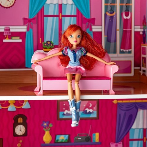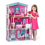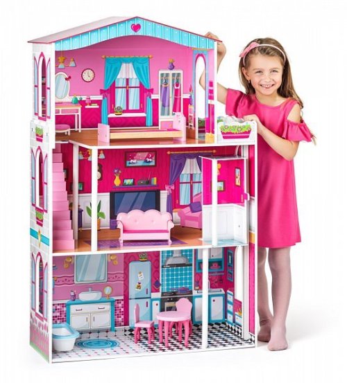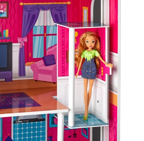 Nový dizajn domčeka Mirabella vznikol v spolupráci s českou výtvarníčkou a na prvý pohľad zaujme svojou farebnosťou. Tento kvalitný trojposchodový domček je určený pre bábiky typu Barbie (30 cm) a je dodávaný vrátane zobrazeného príslušenstva (7 ks). Nábytok je vyrobený z kombinácie materiálov drevo / plast / textil . Z prízemia do prvého poschodia sa môžu bábiky zviezť výťahom . Bábiky nie sú súčasťou výrobku.
