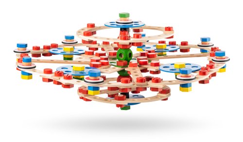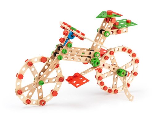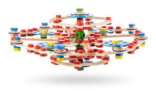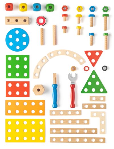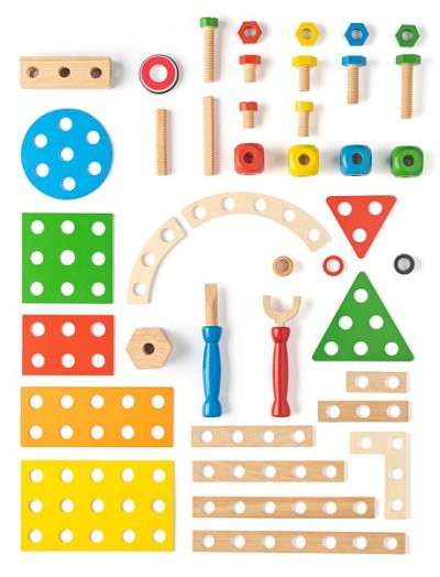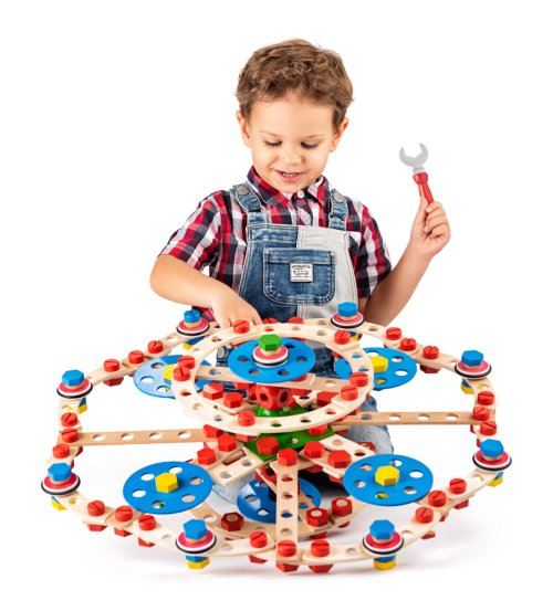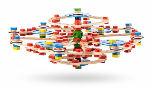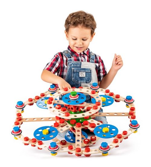 Montážna stavebnica "Engeneer" ponúka deťom konštrukčnú hru s nekonečným množstvom variantov rôznych stavieb od strojov a dopravných prostriedkov cez domčeky, žeriavy až po lietajúce taniere, mosty, veže atď. Obsahuje obrovské množstvo vysoko kvalitných drevených dielov ( drevené doštičky v rôznych tvaroch, matice, skrutky, kolieska, podložky, skrutkovač a montážny kľúč, atď...), s ktorými sa ľahko pracuje a ktoré po zatiahnutí skrutiek vytvoria pevnú konštrukciu. Vek: 3+. Veľkosť dielika so 6timi dierkami: 22 cm, veľkosť obdĺžnikovej doštičky: 18,5 x 11 cm. Počet ks: 340