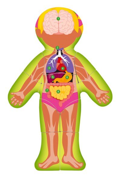Drevené puzzle s motívom ľudského tela. Edukatívne puzzle, ktoré zoznamuje so stavbou ľudského tela a ľudských orgánov. Dvanásťdielkové puzzle s dievčaťom, ktoré má na rube jednotlivých dielikov vyznačené ľudské orgány. Dieliky vložíte do podkladového obrázku, kde je zobrazená stavba ľudskej kostry. Na podkladovom obrázku je tiež uvedený číselný zoznam orgánov a ľudských kostí. Vhodné pre deti od 3 rokov.