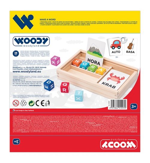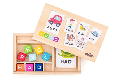 Hra Poskladaj slová predstavuje zmysluplné poznávanie písmen a skladanie slov. Dieťa si vyberie obrázok s krátkym názvom a zasunie ho do stojanu. Na farebných kockách sa potom snažia nájsť jednotlivé písmená a správne ich poskladať.