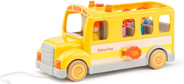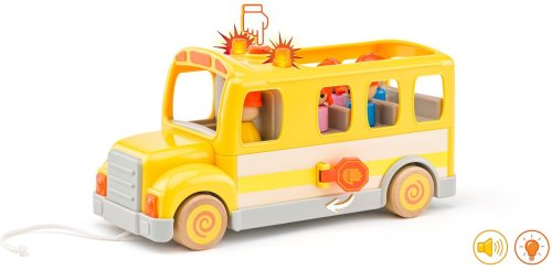 Školský autobus je vyrobený v kombinácii kvalitného plastu a dreva Obsahuje figúrku vodiča a 4 detí Má otváracie dvierka a vyklápaciu značku "STOP" pre bezpečný výstup a prechod cesty Stlačením tlačidla na kabíne sa aktivuje svetlo a zvuk Šnúrka na ťahanie Vhodné pre deti od 18 mesiacov Prevádzka na batérie 3x