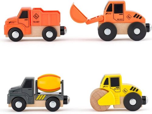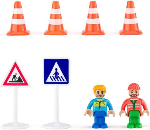 4 autíčka, 1 vozík, 2 plastové figúrky, 4 výstražné kužele, 2 dopravné značky nákladné auto, bager, miešacie auto, cestný valec možnosť pripojenia pomocou magnetov