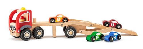 Praktický ťahač s návesom pre malých vodičov od značky Woody. Ťahač, náves aj autá sú vyrobené z tvrdého masívneho driev a. Poschodová plošina pre autá sa dá sklopiť tak, aby autá mohli nabehnúť a zase zísť z rampy. Ťahač a náves sa dajú odpojiť.