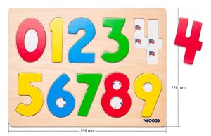 Drevená farebná vkladačka bez úchytiek pre deti na prvé zoznamovanie s číslami a číslicami. Pod každou číslicou je zároveň vyobrazený zodpovedajúci počet obrázkov. Jednotlivé dieliky (číslice) sa umiestňujú do vyfrézovaných obrysov na drevenú dosku.