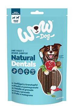 Krásne zúbky a svieži dych vďaka dentálnym tyčinkám WOW Dog. Chutné, výživné, hypoalergénne a účinné! Dentálna maškrta pre dennú starostlivosť o psie zúbky s hydrolyzovaným hydinovým proteínom, vápnikom, mätou a granátovým jablkom.