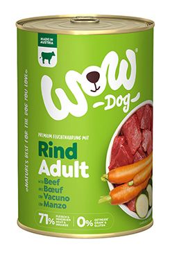 WOW Hovädzie s karotkou je kompletné mokré krmivo pre dospelé psy všetkých plemien so 71% obsahom mäsa a vnútorností od popredného rakúskeho výrobcu. Mäso je doplnené zeleninou, bylinkami z Álp a vysoko kvalitným ľanovým olejom. Konzervy sú ručne plnené v rodinnej rakúskej firme z miestnych, väčšinou alpských, surovín zo zdravej prírody.