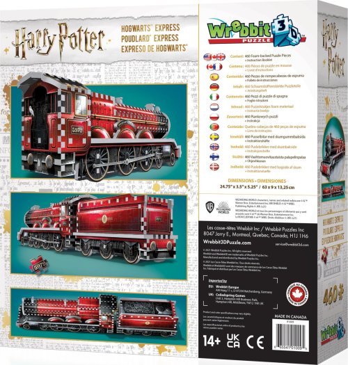 Vlak do školy čiar a kúziel v Rokforte je pripravený na odchod! Poskladaj si Rokfortský express, ktorý je vždy pristavený pri preslávenom nástupišti 9 ¾ na londýnskej stanici King's Cross, odkiaľ odchádzajú všetci študenti tejto školy. Roztrieďte, zložte a vytvorte 3D model. Trojrozmerné puzzle WREBBIT kombinuje výzvu a zážitok. Puzzle sa skladá podľa referenčných obrázkov na krabici a čiernobieleho obrázkového návodu. Vďaka dômyselne navrhnutému tvaru a hrúbke dielikov drží pri sebe bez nutnosti lepenia.