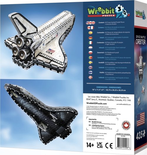 Postav si vlastný raketoplán a vydaj sa na vesmírne dobrodružstvo! Poskladaj si družicový stupeň raketoplánu, ktorému sa tiež hovorí Orbiter. 3D model je verný svojmu veľkému vesmírnemu bratovi. Orbiter je najdôležitejšia a zároveň jediná časť lode, ktorá sa dostane do vesmíru a následne pristane na zemi. Ide o jednoplošník so samonosným krídlom. Roztrieďte, zložte a vytvorte 3D model. Trojrozmerné puzzle WREBBIT kombinuje výzvu a zážitok. Puzzle sa skladá podľa referenčných obrázkov na krabici a čiernobieleho obrázkového návodu. Vďaka dômyselne navrhnutému tvaru a hrúbke dielikov drží pri sebe bez nutnosti lepenia.