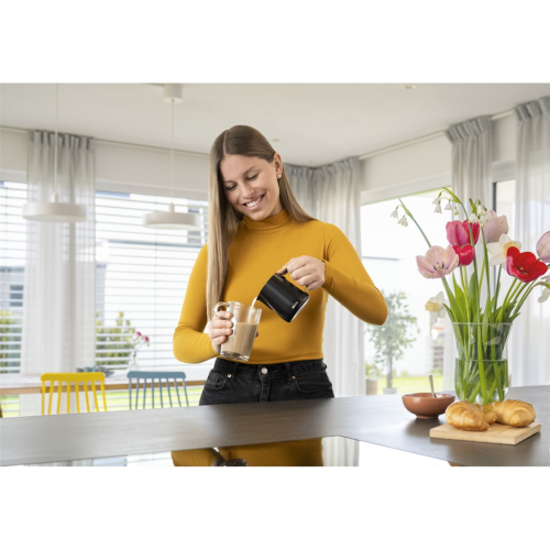 Tip pre dokonalú mliečnu penu s pomocou ručného napeňovača mlieka: nalejte maximálne 175 ml mlieka do nádoby a šľahajte, kým mlieko nie je krémové.