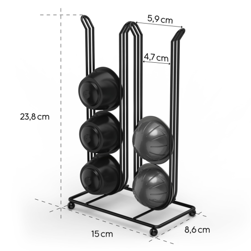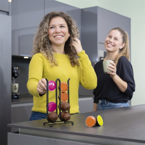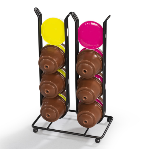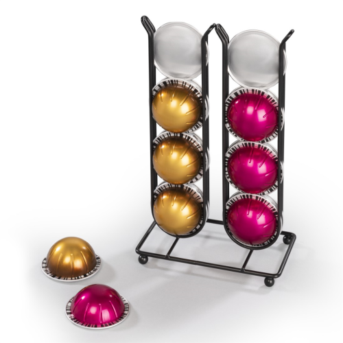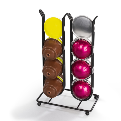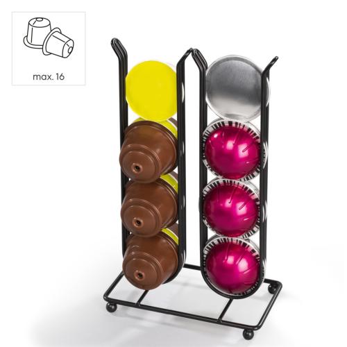 - elegantný drôtený stojan na prehľadné uloženie a usporiadanie kávových kapsúl - vhodný pre kapsule značky Dolce Gusto a Nespresso Vertuo, prípadne pre kapsule podobnej veľkosti, napr.