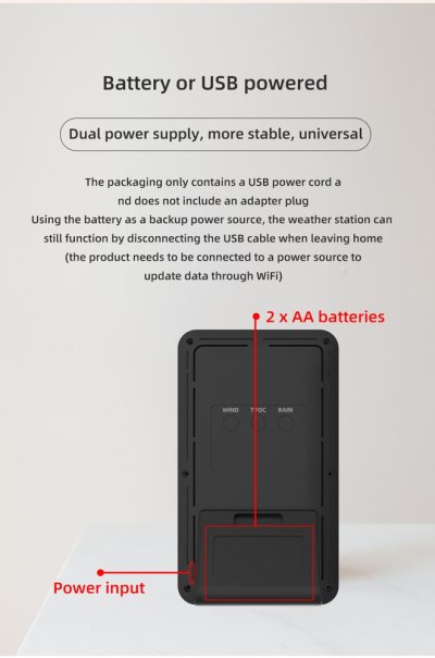 Napájanie vnútornej jednotky: 5 V DC a 2× AA batérie (USB adaptér nie je súčasťou)