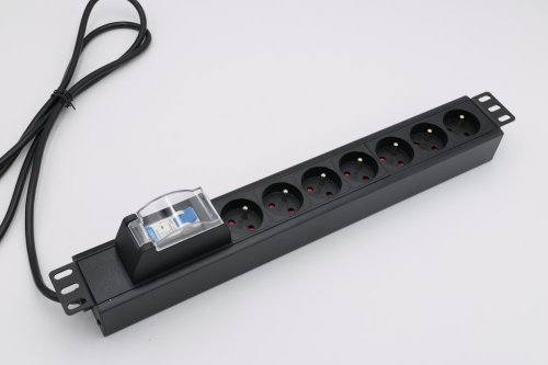 19" rozvodný panel 7× 230 V , zásuvky podľa ČSN, nadprúdový istič / vypínač , ADV, výška 1,5 U , prívod 1,8 m.