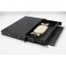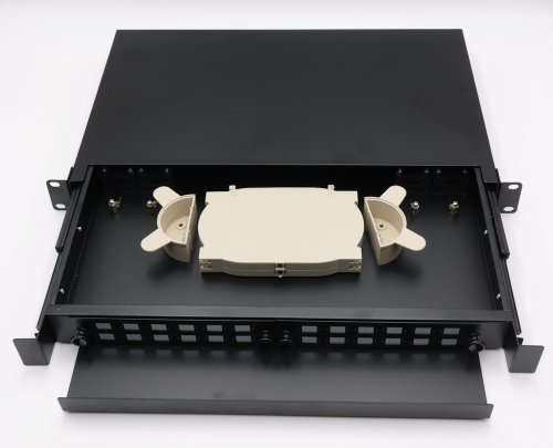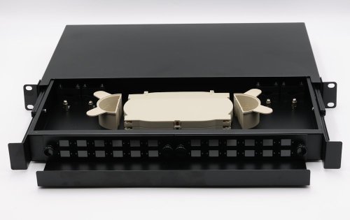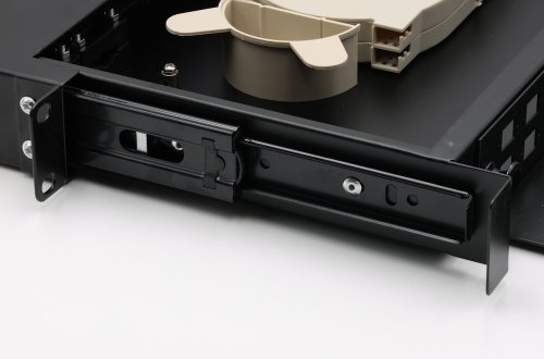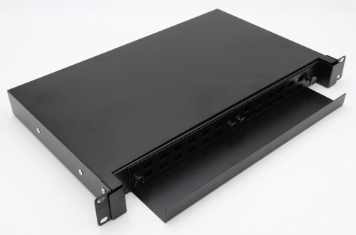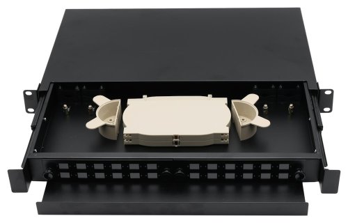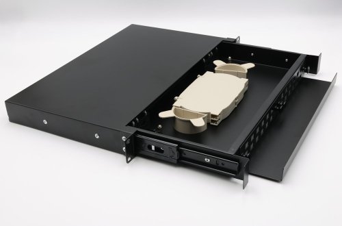 19" rozvádzač, výška 1U, pre 24 simplex adaptérov SC alebo duplexných LC , farba čierna, kovová skriňa, kazeta na zvarky. Vaňa sa vysúva pomocou pojazdových koľajníc.