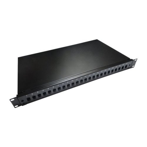19" optický rozvádzač , farba čierna, kovová skriňa hĺbky 245 mm, kazeta na 24 zvarkov , vaňa výsuvná.