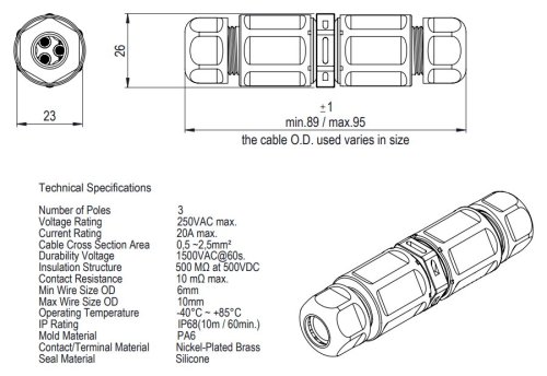 Materiál: PA6 – polyamid 6 (UV odolný), silikón (tesnenie), niklovaná mosadz (kontakty)
