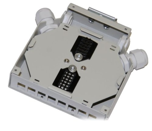 Malý kovový rozvádzač na upevnenie na DIN lištu . Dovoľuje inštalovať 8× SC simplex adaptér. Robustné kovové prevedenie, 4× vstup (2× zaslepený + 2× PG11). Kábel nie je nutné prevliekať, možno aj len založiť.