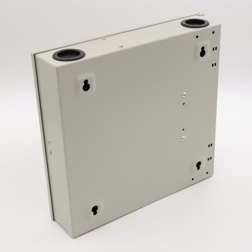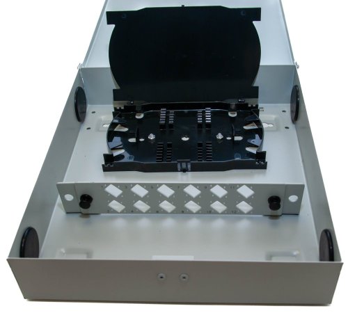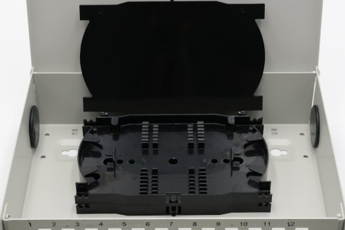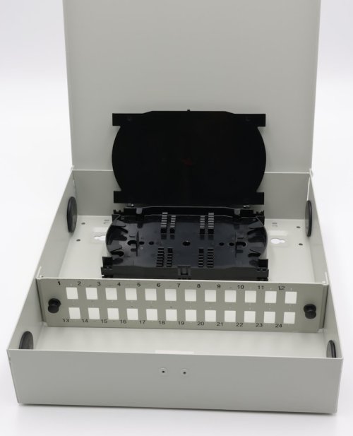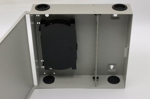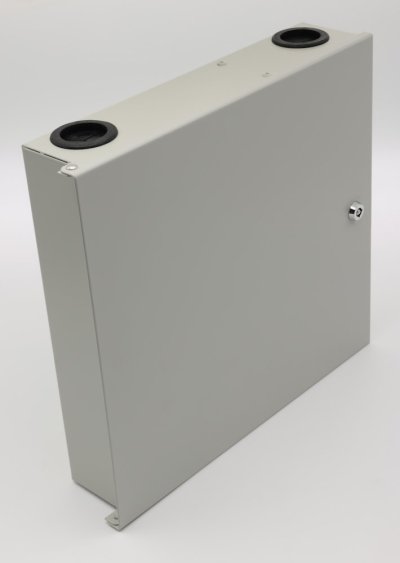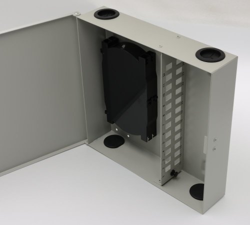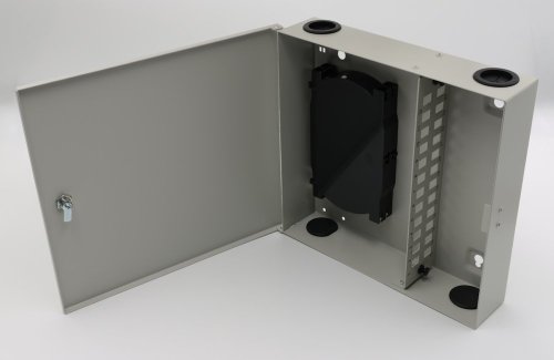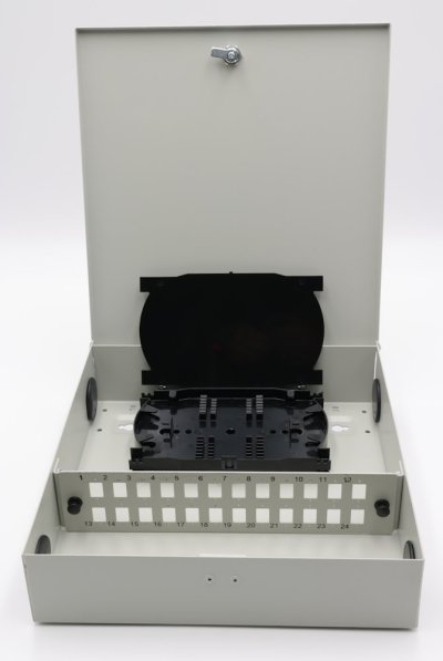 Nástenný optický rozvádzač pre 24 vlákien, 24× simplex SC alebo duplex LC , farba svetlo šedá, kovová skriňa, kazeta na zvarky , zámok.