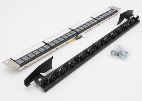 Patch panel 1U, 24 otvorov , veľkosť 19" , neosadený, Cat5e/6/6a/7 , vyväzovák s podporou uviazania káblov.