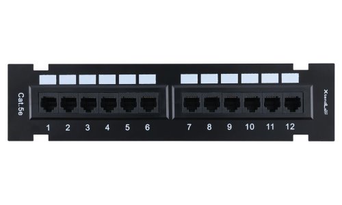 Prepojovací patch panel na stenu s 12 portami RJ-45, Cat5e, narážacie kontakty . Čelný panel je ľahko odnímateľný zo stenového plastového rámčeka.