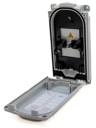 Vodeodolný FTTH plastový rozvádzač. Otvory pre vlákna, vnútorná pozícia pre 4 ks simplexných SC adaptérov (nie sú súčasťou dodávky).