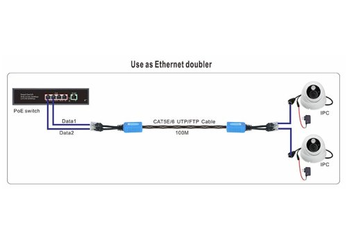 Multifunkčný RJ-45 splitter/extender dokáže spojiť dva PoE vstupy (2× 25 W - 802.3at) a zdvojnásobiť tak napájací výkon, alebo prenášať dáta z dvoch ethernetových vstupov pomocou jedného kábla.