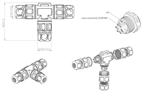 Vodotesná spojka typu T pre drôtové vodiče do priemeru 2,75 mm a káble s priemerom 5,5–8,5 mm.