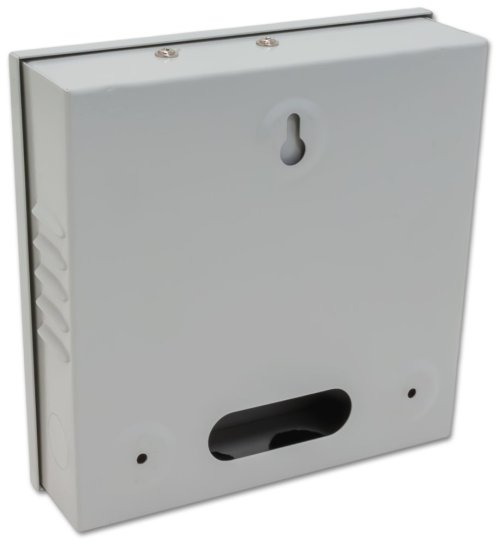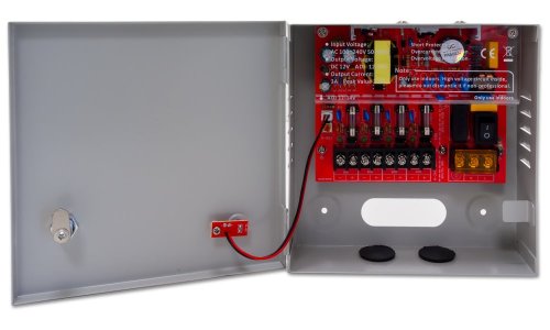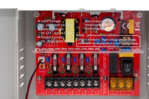Stabilizovaný napájací zdroj pre štyri spotrebiče, nastaviteľné napätie DC 12-14 V, každý port max. 1 A. Celkový výstupný prúd 3 A, krátkodobo 3,5 A. Skrinka na stenu s inštalovaným PCB s hlavným vypínačom a káblovými priechodkami. Pripojenie káblov k internej svorkovnici. Ochrana proti skratu prístrojovou poistkou, ochrana proti prepätiu. LED signalizácia funkčnosti portov. Dvierka sú vybavené jednoduchým zámkom.