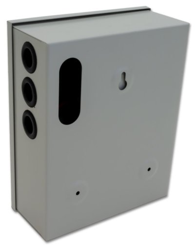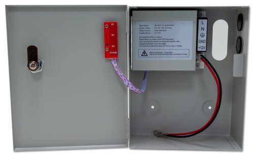 Stabilizovaný napájací zdroj s jedným výstupom, s okruhom na nabíjanie a pripojenie záložnej batérie. Celkový výstupný prúd 3 A. Skrinka na stenu s inštalovaným PCB, káblové priechodky, vypínač vo vnútri skrinky. Pripojenie káblov k internej svorkovnici, možnosť odpojenia výstupu prepojkou bez nutnosti odpájania vodičov. Ochrana proti skratu prístrojovou poistkou, ochrana proti prepätiu. LED diódy diagnostikujú stav portov, na prvý pohľad je napr. rozpoznateľná vyhorená poistka. Batériový okruh dobíjaný 1 A. Ochrana proti skratu batérie a ochrana batérie proti úplnému vybitiu.