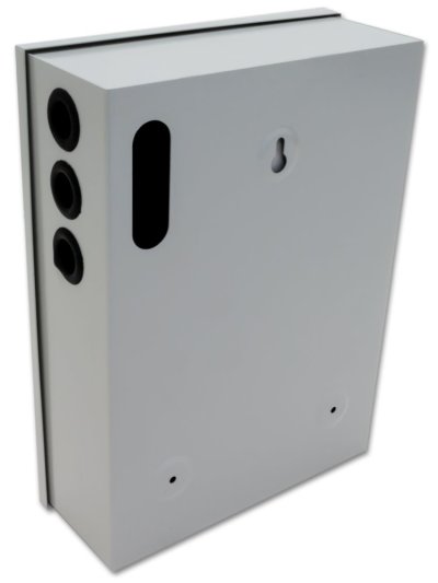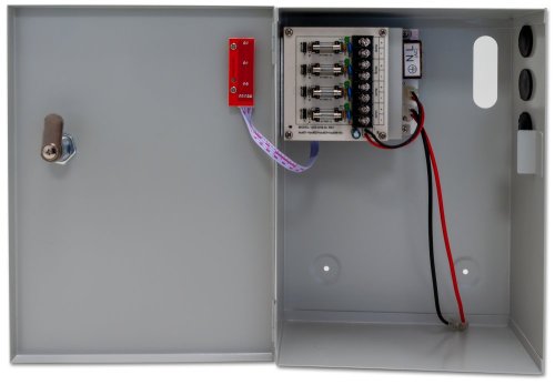 Stabilizovaný napájací zdroj pre štyri spotrebiče s okruhom na nabíjanie a pripojenie záložnej batérie. Celkový výstupný prúd 3 A. Skrinka na stenu s inštalovaným PCB, káblové priechodky, vypínač vo vnútri skrinky. Pripojenie káblov k internej svorkovnici, možnosť odpojenia výstupu prepojkou bez nutnosti odpájania vodičov. Ochrana proti skratu prístrojovou poistkou, ochrana proti prepätiu. LED diódy diagnostikujú stav portov, na prvý pohľad je napr. rozpoznateľná vyhorená poistka. Batériový okruh dobíjaný 1 A. Ochrana proti skratu batérie a ochrana batérie proti úplnému vybitiu.