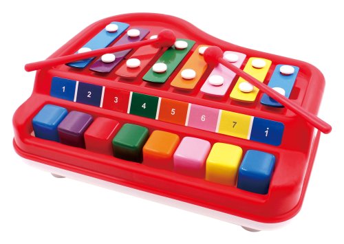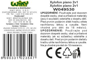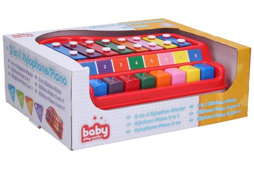 Xylofón piano 2v1. Veľkosť 24cm. Obsahuje xylofón a dve paličky. Možnosť hrať klasicky paličkami, alebo stláčať klávesy, ktoré rozoznievajú xylofón tiež. Jednotlivé klávesy a doštičky sú farebne rozlíšené. Na obale 4 pesničky, ktoré je možné hrať podľa farebnej schémy.