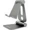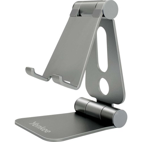 Skladací systém Zliatina hliníka Nastaviteľná výška a náklon Stolný kovový držiak vhodný pre mobilné telefóny a tablety do maximálnej veľkosti uhlopriečky 7"". Ideálny sklon a výšku nastavíte vďaka dvom polohovateľným kĺbom. Držiak je možné zložiť do vodorovnej polohy vhodnej na prepravu. Zariadenie môžete položiť na držiak v horizontálnej alebo vertikálnej polohe. Výrezy na káble podporujú nabíjanie zariadenia počas položenia na držiak.