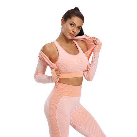 Súprava dámskeho športového oblečenia Yoga Sense fitness set sa skladá z troch kusov - športové podprsenky, krátke mikiny so stojačikom a zapínaním na zips a dlhých legín. Podprsenka má vykrojené ramienka na chrbte a vyberateľné košíčky. Mikina v štýle crop top má dlhý rukáv s otvorom na palec. Celý set oblečenia je z látky so špeciálnou technológiou, ktorá svojím vzorom dokáže do určitej miery tvarovať krivky. Každý kúsok je doplnený o detaily v kontrastnej farbe. Športové oblečenie môžete využiť takmer na všetky športové aktivity, od fitness cez behanie až po jogu alebo pilates. Zloženie: 90% polyamid, 10% polyester. Perte maximálne na 30 °C s podobnými farbami. Veľkosť S: Podprsenka cez hrudník: 36 cm, pod hrudníkom: 30, dĺžka: 35 cm Mikina dĺžka: 41 cm, šírka hrudníka: 32 cm, šírka ramien: 34 cm Legíny dĺžka: 85 cm, šírka pása: 30 cm, šírka bokov : 33 cm Veľkosť M: Podprsenka cez hrudník: 38 cm, pod hrudníkom: 32 cm, dĺžka: 36 cm Mikina dĺžka: 41 cm, šírka hrudníka: 34 cm, šírka ramien: 37 cm Legíny dĺžka: 90 cm, šírka pása: 32 cm, šírka bokov: 36 cm Veľkosť L: Podprsenka cez hrudník: 40 cm, pod hrudníkom: 34 cm, dĺžka: 37 cm Mikina dĺžka: 43 cm, šírka hrudníka: 37 cm, šírka ramien: 39 cm Legíny dĺžka: 92 cm, šírka pása: 33 cm, šírka bokov: 38 cm