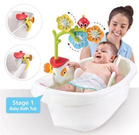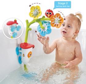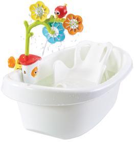 Vtáčí domček s batériovým čerpadlom, Senzorický oblúk s otáčacími kvetinami a vtáčikom, Kryt batérií so svorkou pre detské vaničky, Kryt batérií s prísavkami pre bežné vane