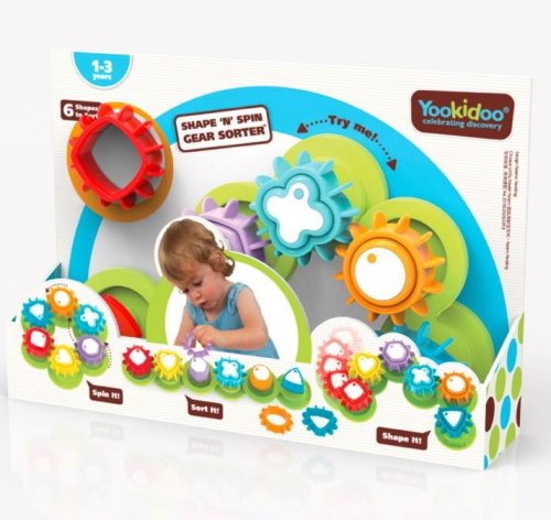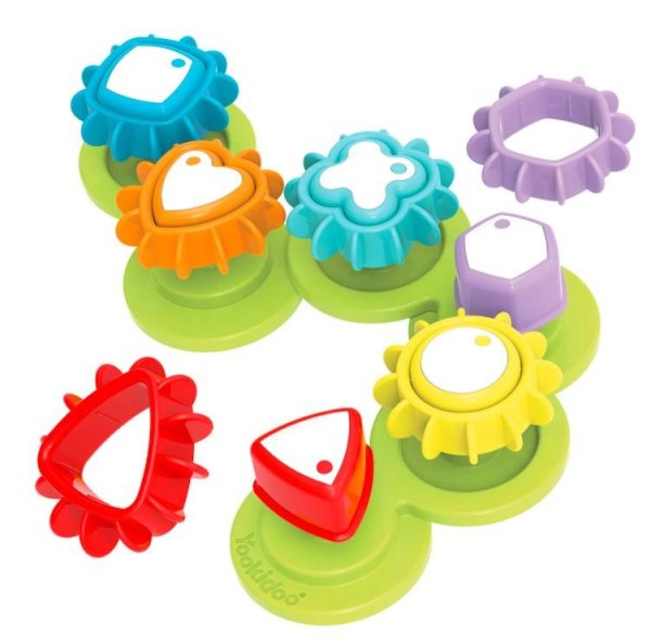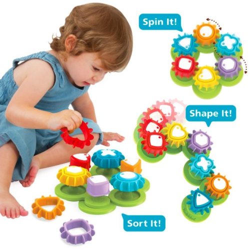 Okolo jedného roku veku získa vaše dieťa väčšiu kontrolu nad svojimi malými ručičkami a je vhodný čas na rozvoj jemnej motoriky. Veľké ľahko uchopiteľné farebné geometrické tvary sú skvelým pomocníkom, ako sa s dieťaťom začať učiť rozpoznávanie farieb a tvarov. Povzbuďte svoje dieťa, aby objavovalo a skúmalo rôzne tvary a pohyb rotujúceho zariadenia. Ukazujte mu farby a tvary a chváľte ho za správne umiestnenie častí. Uvedomte si, že učenie pomocou pokusov a omylov je veľmi dôležité pre výučbu vášho dieťaťa. Ukážte mu rôzne obrazce vytvorené z hračky a zdieľajte jeho potešenie zo skutočnosti, že bez ohľadu na rozvrhnutie sa ozubené kolesá budú vždy točiť, pokiaľ správne priradia farby a tvary.