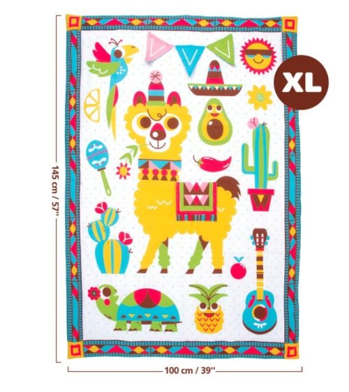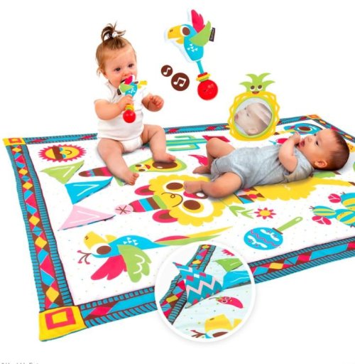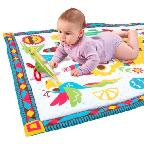 Veľká hracia deka umožňuje dieťaťu pohybovať sa, prevrátiť sa a preskúmať jeho okolie, čím sa predĺži doba hry na brušku. Ilustrácie s farebnými kontrastmi stimulujú zrak a kognitívne schopnosti. Veľké zrkadlo podporuje opakované zdvíhanie hlavičky a rozvíja svaly krku a ramien, ktoré sú dôležité pre vývoj dieťaťa. Šuštivé vlajky pod sebou ukrývajú obrázky a zároveň stimulujú hmat aj sluch. Hudobná hrkálka, ktorá po zatrasení vydáva zábavné zvuky učia dieťa vzťahu príčina-následok.