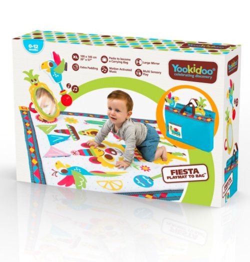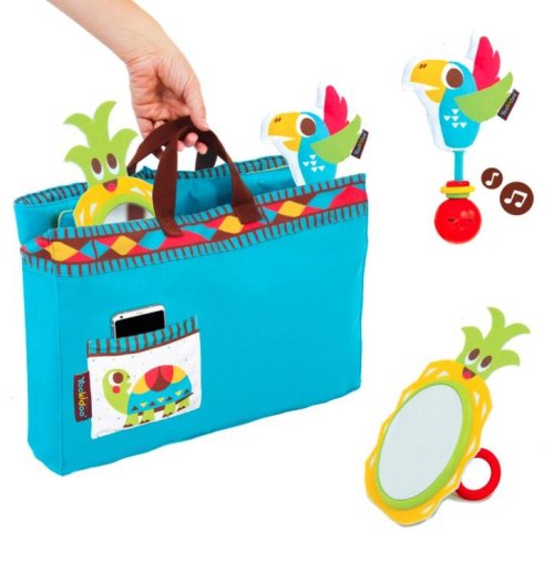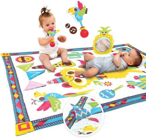 Obsah balenia: skladacia hracia deka, veľké zrkadlo s hrkálkou a hryzátkom, zvuková hrkálka papagáj.