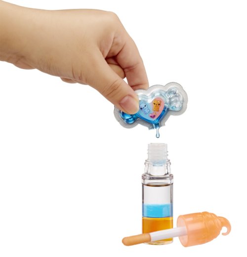 1. Otvor tubu s leskom na pery. 2. Pridaj do tuby farbu. 3. Farby premiešaj. Roztomilá voňavá bábika má outfit a topánky, ktoré môžeš zložiť. Bábiku aj lesk na pery si môžeš vziať na cesty, stačí spojiť s príveskom na kľúče.