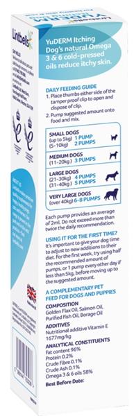 1 stlačenie pumpičky = cca 2 ml. Prvý týždeň odporúčame podávať iba polovičnú dávku, než si pes zvykne. Pri mini plemenách podávajte 2 ml každý druhý deň. Podávajte spolu s kŕmením a premiešajte. Skladovanie: Oleje sú citlivé na kyslík a slnečné svetlo. Fľašu uchovávajte na chladnom, tmavom a suchom mieste pri teplote do 25 °C, ideálne v krabičke v chladničke.