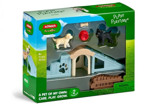 Hore, dole, tam a späť – čas na dobrodružstvo pre šteniatka udržuje malých psíkov neustále v pohybe. Dve veselé šteňatá zbehnú po rampe, šantia okolo koterca a hneď zase vyskočia po schodíkoch na strechu koterca na druhej strane. Znova a znova, kým nie sú úplne vyčerpaná. Potom už hurá do útulnej búdičky. Tam si môžu na chvíľu zdriemnuť alebo sa posilniť vodou z misky a šťavnatou kosťou. Možno sa po prestávke strecha búdy premení na hojdačku? Potom zábava začína nanovo. Tí dvaja sú jednoducho neúnavní. Obsah sady: 1x ihrisko pre šteniatka, 2x figúrka šteniatka, 1x plot, 1x miska a 1x kosť. Strechu psie búdy možno odňať a použiť ju ako hojdačku. Strecha sa tiež dá zacvaknúť medzi schodmi a rampu. Schody môžete rozmiestniť rôznym spôsobom a podľa toho sa potom na nich hrať. Súprava Schleich® patrí do tematického sveta FARM WORLD a je vhodná pre deti od 3 do 8 rokov. Rozmery balenia: 30 x 39 x 14,5 cm. Nevhodné pre deti do 3 rokov. Vek: 3+