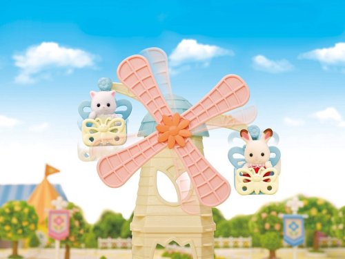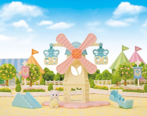 Sada Zábavný park s veterným mlynom a mačiatkom obsahuje veterný mlyn, figúrku a nábytok. V sade ešte nájdete tulipánovú hojdačku, kvetinovú šmykľavku a bábätko perzskej mačky. Vďaka otáčaniu veterným mlynom sa motýlia gondola pohybuje hore a dole. Figúrky bábätiek je možné umiestniť na gondolu a hojdačku. Táto sada obsahuje figúrku a nábytok a je možné sa s ňou hrať samostatne. Tento zábavný park si môžete užiť aj s inými figúrkami bábätiek alebo dvojčiat (všetko sa predáva samostatne). Stimuluje u detí imaginatívne hranie rolí. Vek: 3+