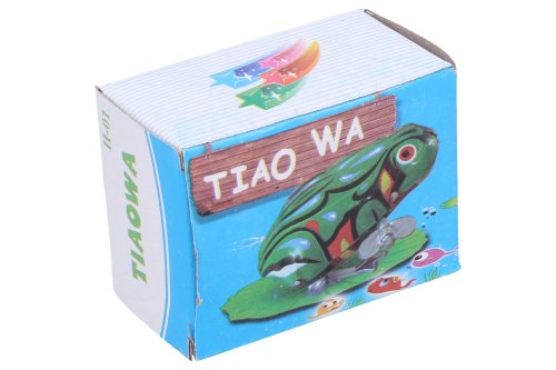 Pohyb plechovej žabky zaisťuje pérový strojček naťahovaný kľúčikom. Rozmery balenia 7 x 5 x 4 cm. Vhodné pre deti od 3 rokov.