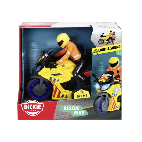 Motorka Yamaha na zotrvačník, so svetlom a zvukom, s pohyblivou figúrkou vodiča. Dĺžka 17 cm.