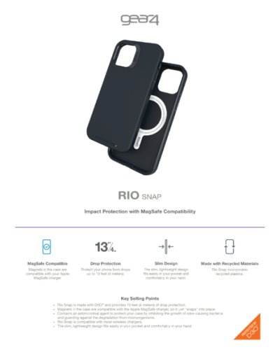 Ochranný kryt kompatibilný so systémom Apple MagSafe. Kryt je vyrobený z materiálu D3O®, vďaka ktorému vaše zariadenie ochráni pri pádoch z výšky až 4 metrov. Kryt je navyše obohatený o antimikrobiálnu vrstvu RepelFlex™. Ochranný kryt Gear4 Rio Snap je kompatibilný s MagSafe. Vďaka zabudovaným magnetom kryt k nabíjačkám a ostatnému príslušenstvu dokonale priľne, to zaistí stabilné nabíjanie a ničím nerušené používanie ostatného príslušenstva.