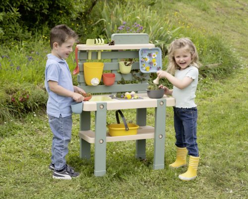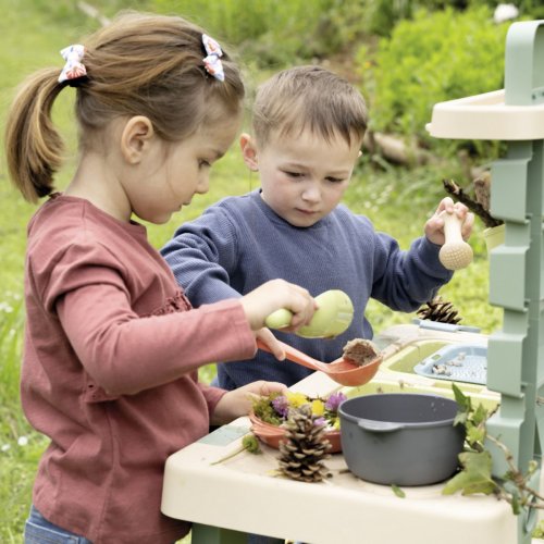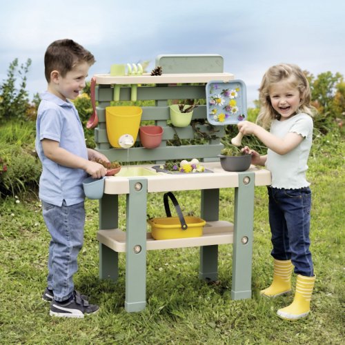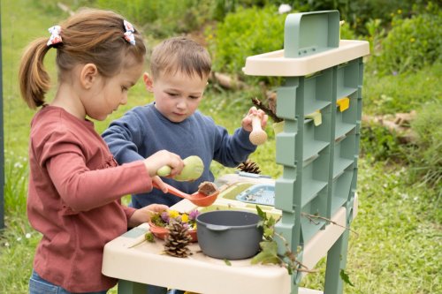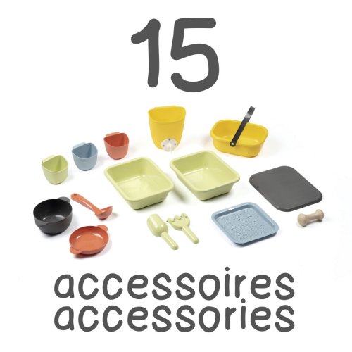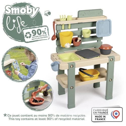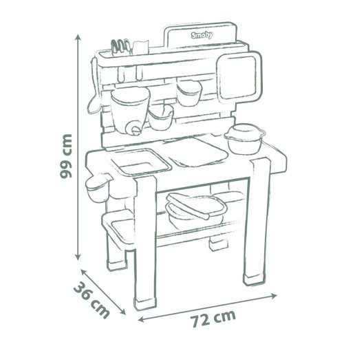 Vonkajšia kuchynka vybavená rôznym príslušenstvom, celkom 15 ks doplnkov. Plastové diely sú ošetrené anti-UV, čo zaisťuje dobrú odolnosť a stálosť farieb v priebehu času. Tento výrobok obsahuje minimálne 90% recyklovaného materiálu. Rozmery výrobku (DxŠxV): 72 x 36 x 99 cm.