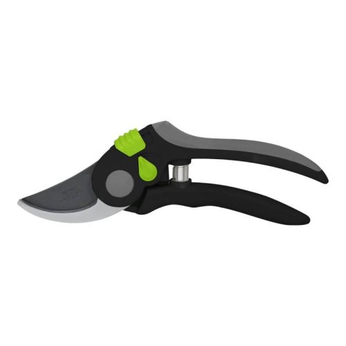 čepeľ z japonskej ocele SK5 s vysokým obsahom uhlíka a teflónovým povlakom čepeľ (priechodná) na strihanie mladých výhonkov a vetví pohodlné nylonové rukoväte regulácia otvárania rukovätí bezpečnostný zámok