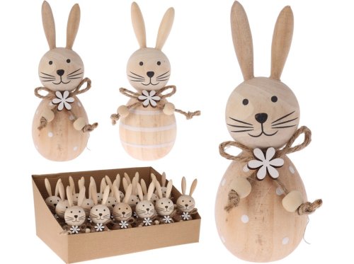 Dekoratívny zajac z dreva o rozmere 43×43×115 mm v prírodných odtieňoch. Jednotlivé kusy sú dodávané v mixe farieb a môžu sa mierne líšiť vzhľadom a tónom.