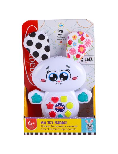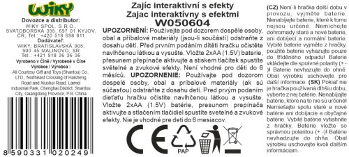 Zajac interaktívny s efektmi. Veľkosť 18 cm. 2xAA batérie súčasťou balenia. Vydáva svetelné a zvukové efekty. Aktivácia tlačidlami na brušku. Funkcia automatického vypnutia. Prepínač na vypnutie a dve úrovne hlasitosti.